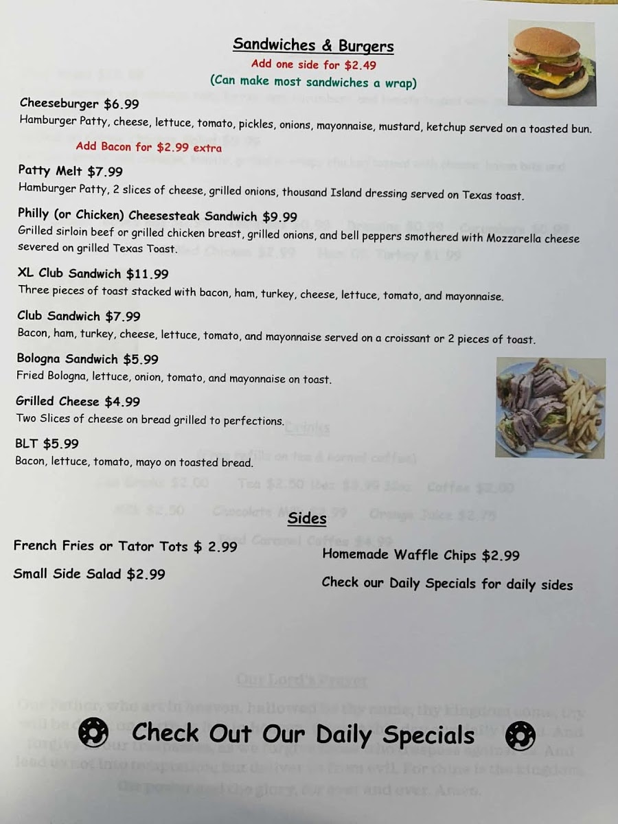 Welcome to Kay's Cafe, located at 808 Jamestown St, Columbia, KY. This cozy establishment prides itself on delivering comforting breakfast and lunch options made with love. The breakfast menu features delightful choices, including the Small Waffle at just $2.50 and a variety of mini pancakes starting from $3.99, perfect for both sweet and savory lovers. The lunch offerings include hearty favorites like the Cheeseburger with Fries for $7.99 and a warm Grilled Cheese for $6.99.